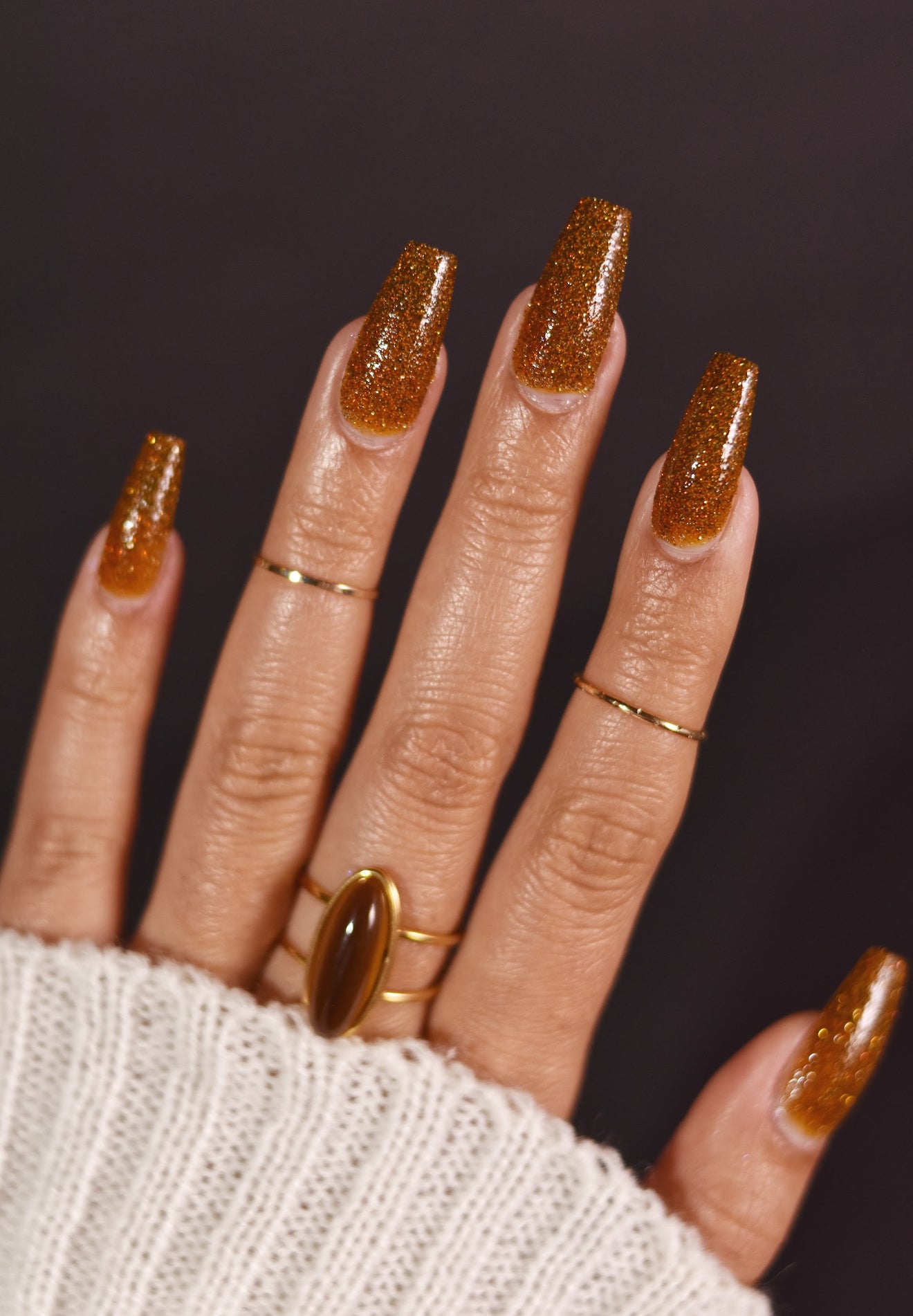Oh My Gourd has a burnt orange base with black reflective glitter works best with the quick dry top coat for a smooth finish